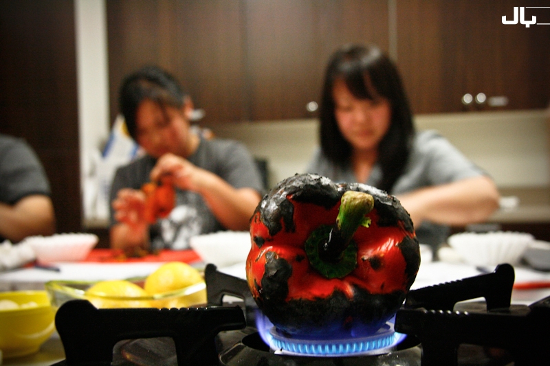 Here I’m demonstrating how to quickly roast a pepper while the class is put to work, peeling off the charred skin.