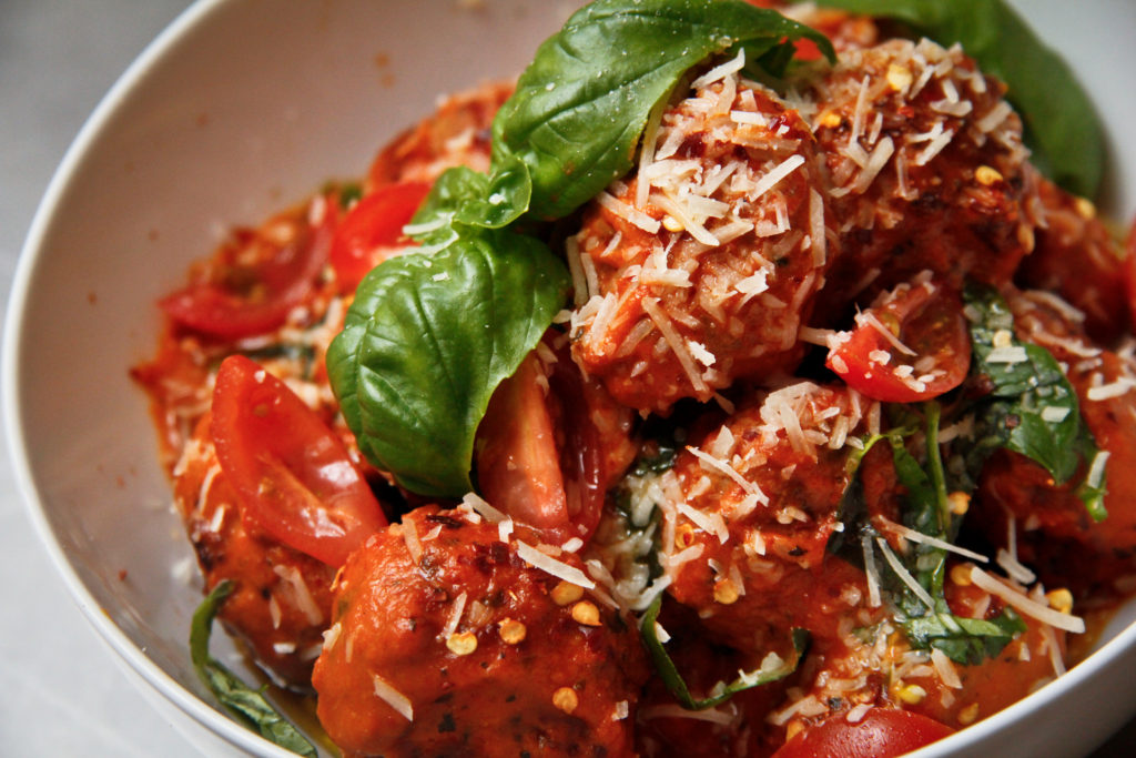 Well without a recipe in mind, I saw some grape tomatoes sitting next to the basil and knew that’s all I needed to make a simplified version of an already easy classic.  Grape tomato bruschetta served alongside with store-bought meatballs, which I pan-seared and then simmered in spicy creamy tomato sauce did just the trick for an easy, red-themed V-day dinner for two.