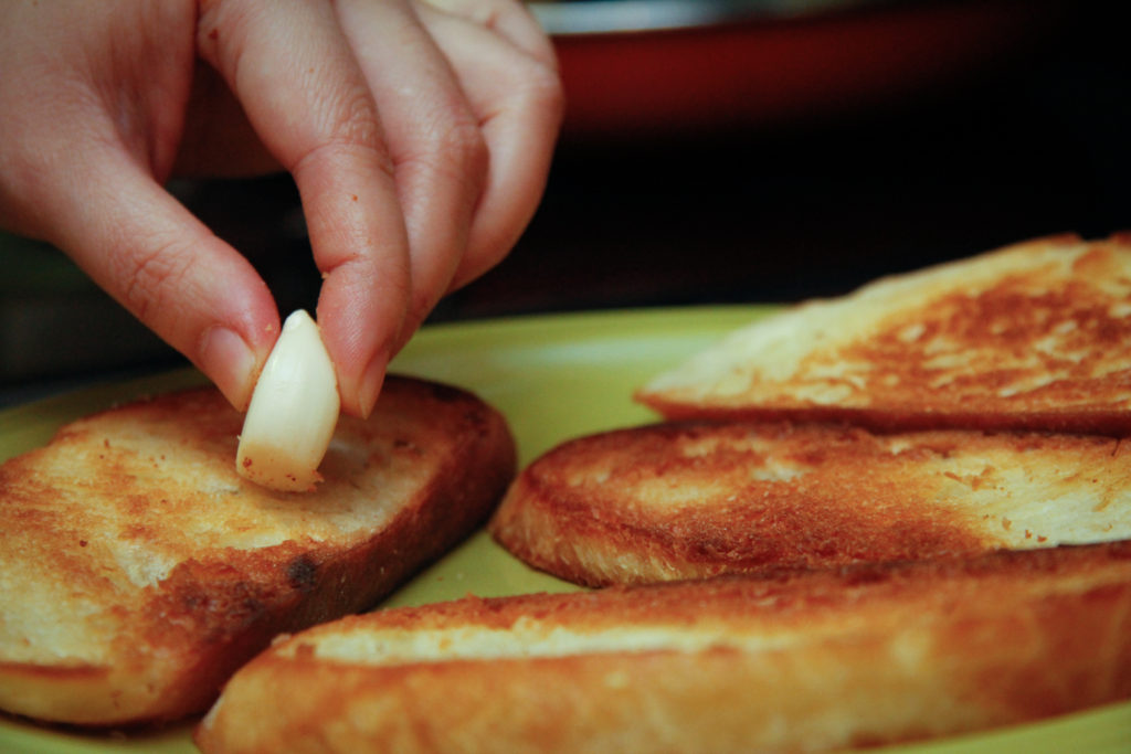 • Cut as many pieces as you want of the French loaf into ½” thick slices. Heat a large pan with a generous amount of olive oil and crisp the bread on both sides until golden brown. Rub the garlic clove on both sides of the hot toasted bread with the cut tip.