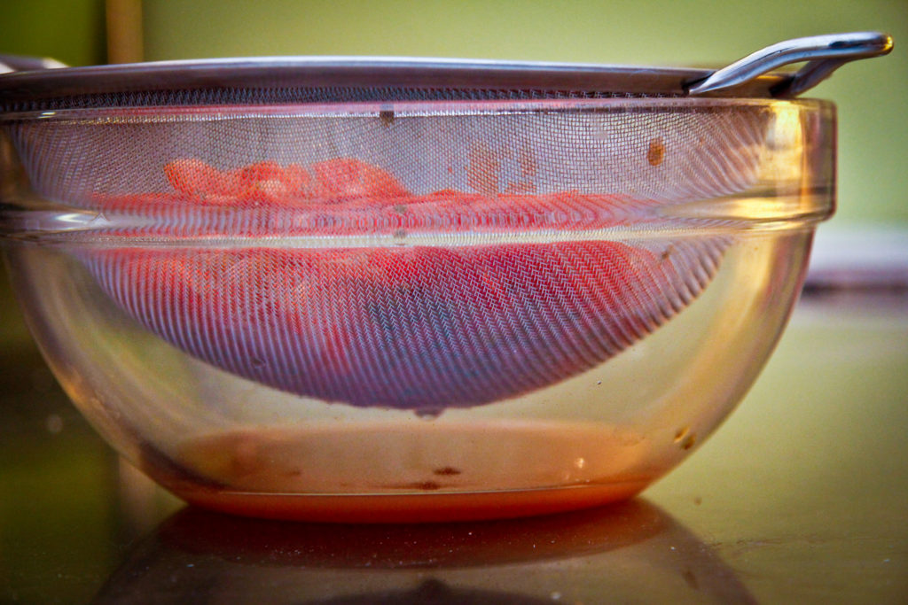 • Slice all the grape tomatoes into quarters, sprinkle with the ¼ teaspoon of salt, toss, and place in a colander for 20 minutes to remove excess moisture.