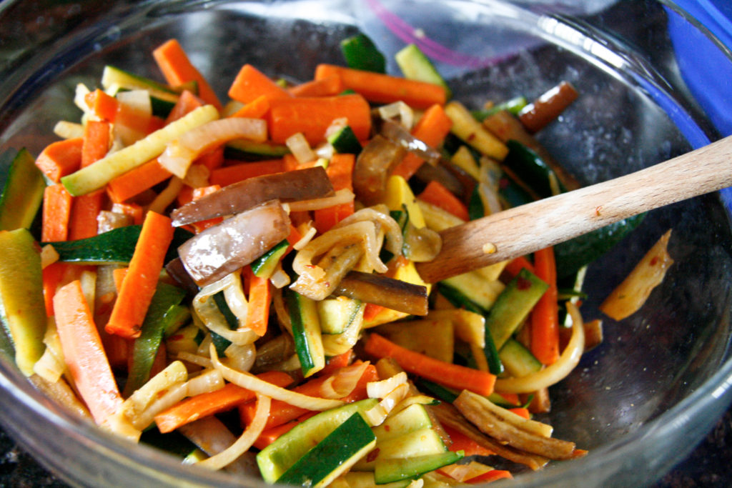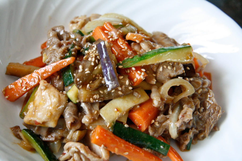Case in point, I just happened to have some mish mash random leftover veggies, one chicken breast, and thinly sliced rib-eye meat in my freezer (which is what a lot of Koreans usually have), so I chopped them up and threw them into a hot pan with some oil until the meat was just cooked through and the veggies were a tad softened, but still firm. I tossed in some oyster sauce and a spoonful of chili garlic to taste, and stirred in the corn starch slurry.