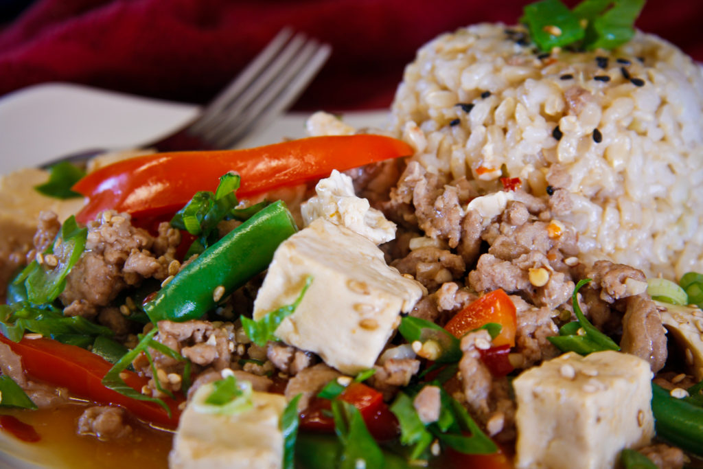 - Add the string beans. Nestle them lightly in the sauce and cover to steam them until they are just crisp tender. Add the red bell pepper and cover to let them steam for one minute. You want the vegetables to remain slightly crisp and colorful, so avoid over-cooking them. Toss everything lightly so it’s nicely mixed. Remove from heat. Sprinkle with chopped green onions and sesame seeds. Serve tofu mixture with brown rice.