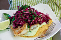 • Arrange the tostadas on individual plates. Place some edamame puree on top of each one. Add the tilapia filets. Toss the softened cabbage with the dressing and place a nice mound on top of each of the filets. Sprinkle with chopped cilantro and serve with lime wedges. To eat, squeeze fresh lime juice on top and break the tostada apart with a fork. Eat everything with a fork, or use your fingers and enjoy as fancy nachos!
