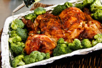 • Strew some broccoli florets around the chicken. Drizzle the broccoli with olive oil, then season with salt, pepper, and garlic powder to taste. Pop the whole thing into a preheated 350 F oven for 10-15 minutes or until heated through. If the chicken is cold from the fridge, heat for 30-45 minutes or until heated through. However, if this is the case, add both the glaze and the broccoli later, after the chicken is just 10 minutes shy of being done. This way the sauce won't burn, and the broccoli won't over cook.