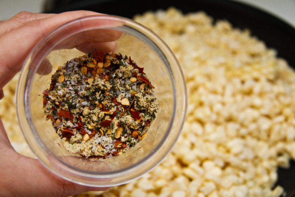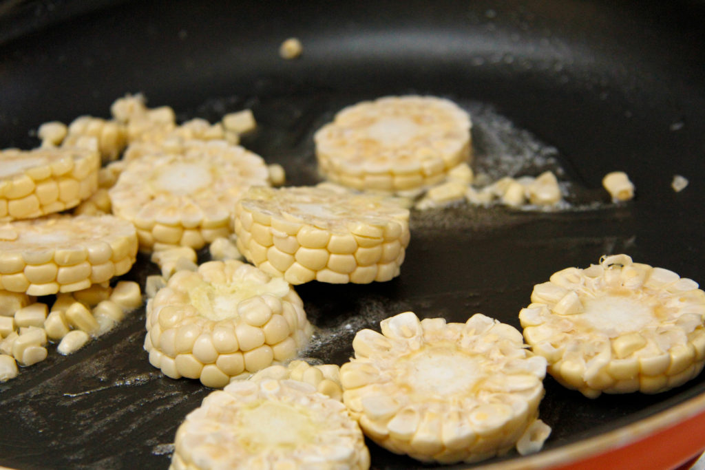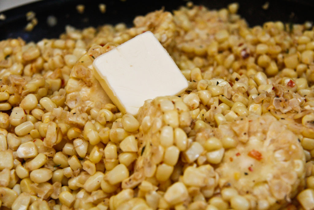 - Heat a large pan and add 1 Tablespoon of butter, along with 1 Tablespoon of olive oil. Add the optional corn rounds first, and after a couple minutes, add the rest of the kernals. Sprinkle on the seasonings and mix well. Cook until the corn is slightly softened, then mount with the remaining Tablespoon of butter.