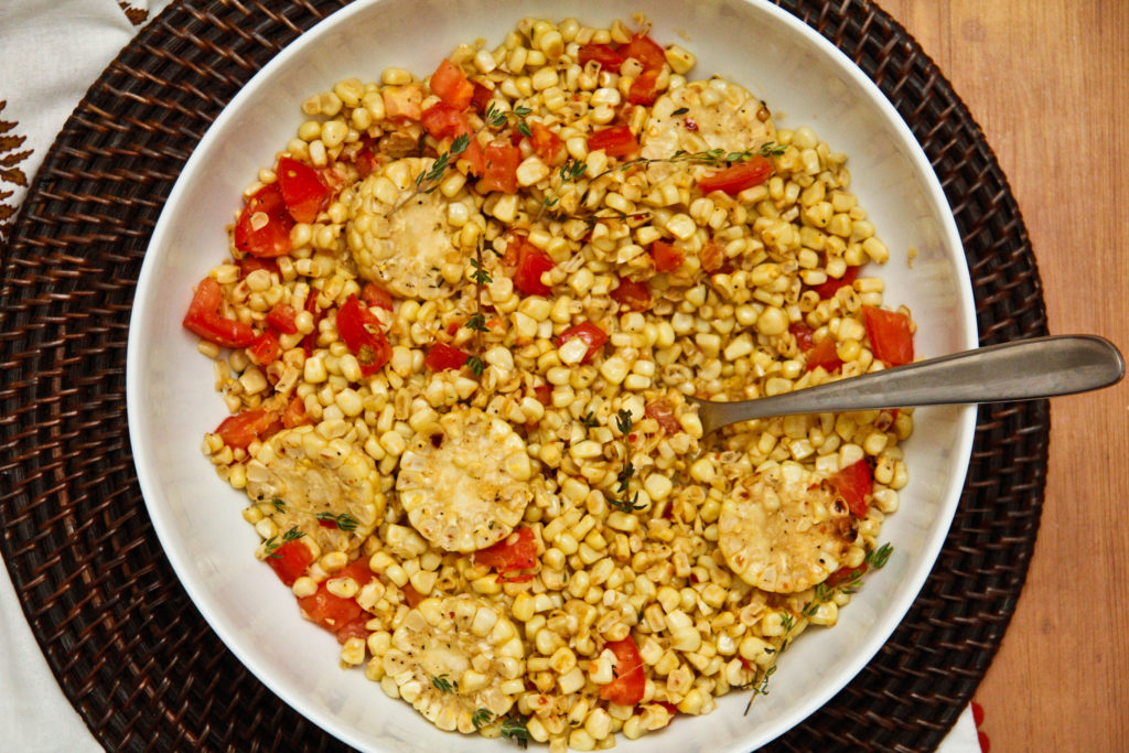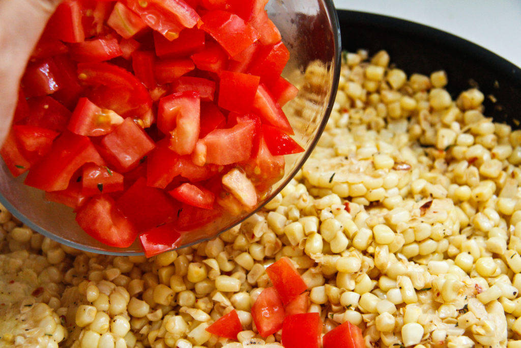 Turn your heat off, but keep the pan on the hot burner. Tumble in your tomatoes, and stir. Let the heat of the corn just slightly soften that tomato. Taste, and adjust seasonings with any extra salt if needed.