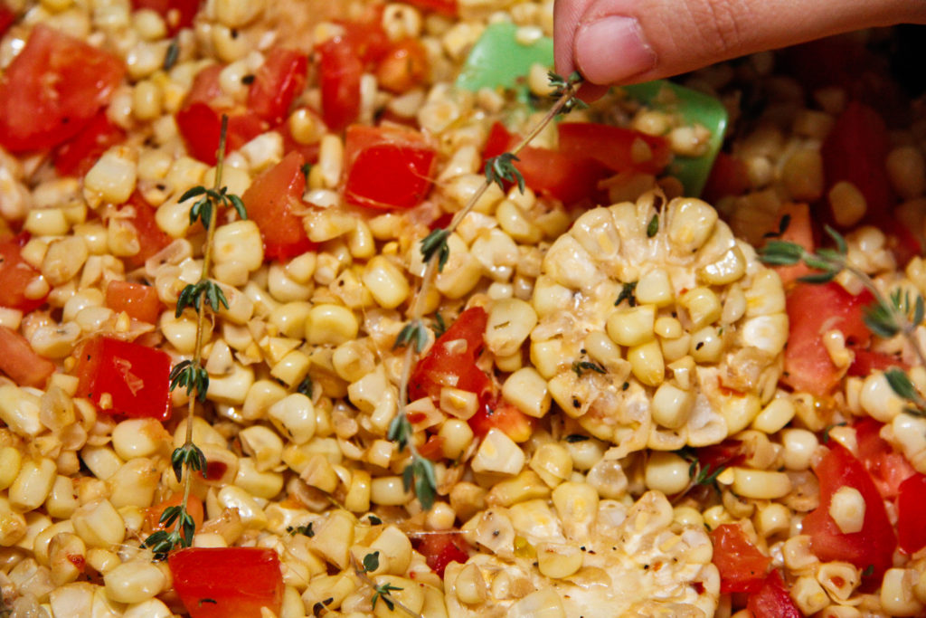 It’s sweet, with a hint of acidity from the tomatoes. The thyme is lemony-fresh, and the garlic and chili flakes give it a little boom boom pow! At the potluck we went to, it was all gone in a lickety split. In fact, I even filmed a vlog of our potluck party, so stay tuned for the video. In the meantime, enjoy this cornlicious dish for yourself. And remember it for when Thanksgiving rolls around.