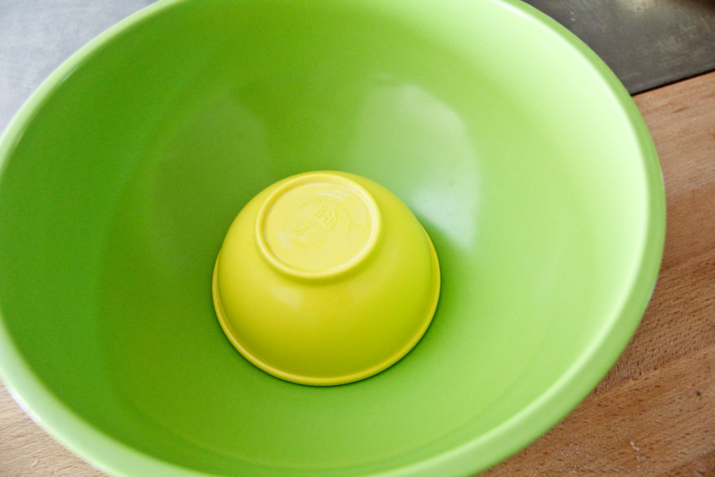 My friend Ashley reminded me of this tip she got from Rachael Ray: Place a small bowl upside down within a larger bowl. This will act as an elevated pedestal you can rest your corn on, so it’s easier to cut the kernels off without them bouncing all around your cutting board or the floor.