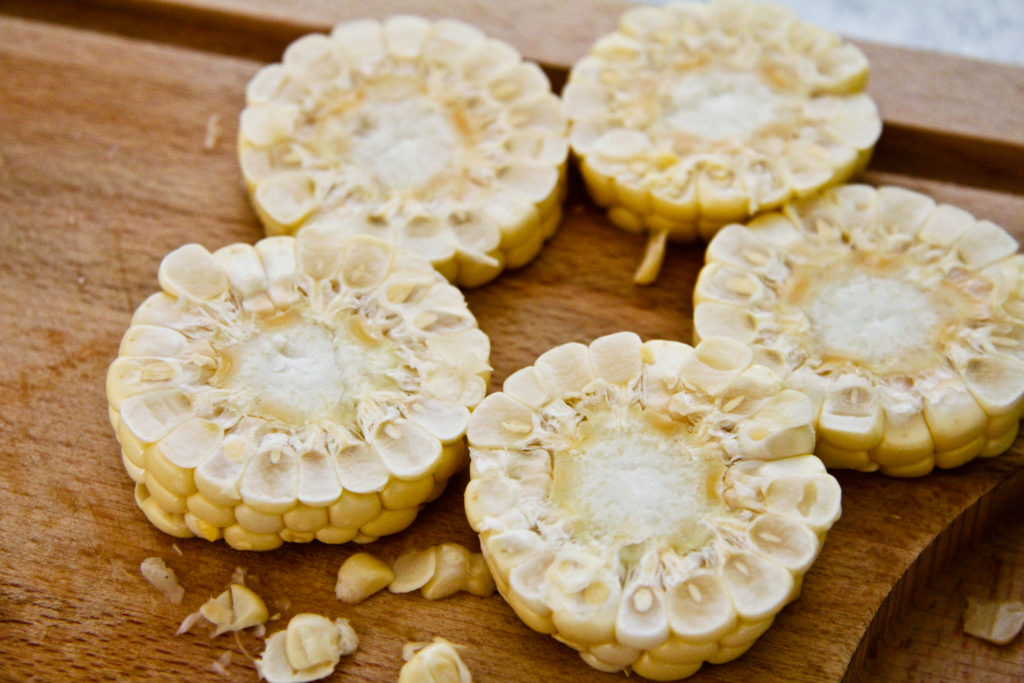 - Remove the husks of your corn and cut off the bottoms to remove any stem. If you want, cut off a ½" round slice from each ear, to add to the presentation of the dish, but this step is not necessary.