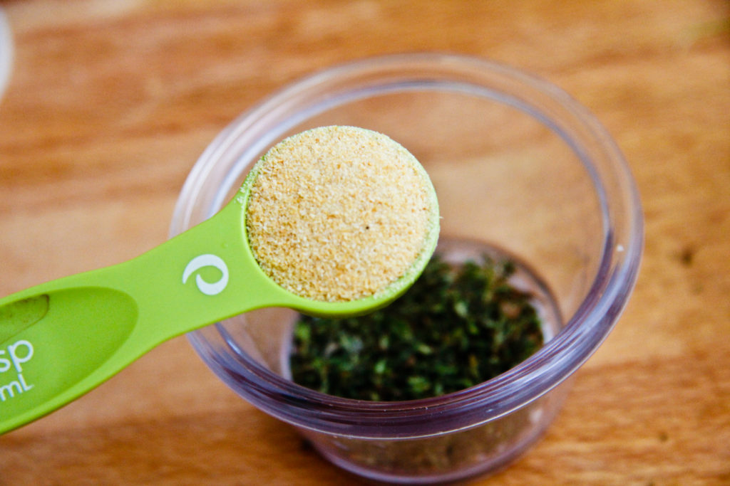 - To a small bowl, add your chopped fresh thyme, as well as salt, garlic powder, black pepper, and crushed red chili flakes.