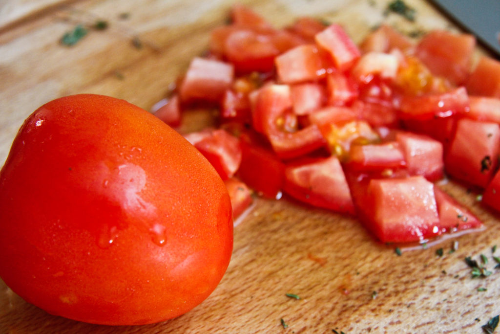 Then you get all your other ingredients prepped. Chop the tomatoes…