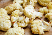 - Pour the florets out over a baking sheet lined with parchment paper, and spread them out. Sprinkle the kosher salt lightly and evenly over the florets and gently toss again on the sheet. Start out by under-seasoning and sprinkle with more salt if needed after the cauliflower comes out of the oven at the end. You can always add more salt, but you can’t take it away.