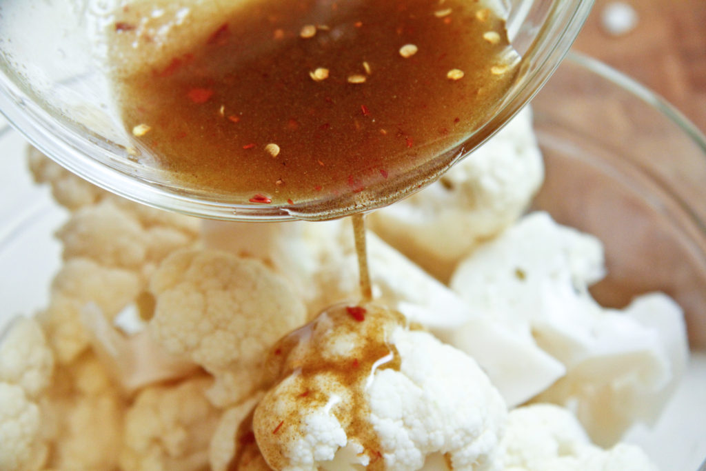 - In a small bowl, add oil, cumin, and crushed red chili flakes. Mix together and drizzle over the florets. Toss the florets with the oil, making sure everything is well coated.