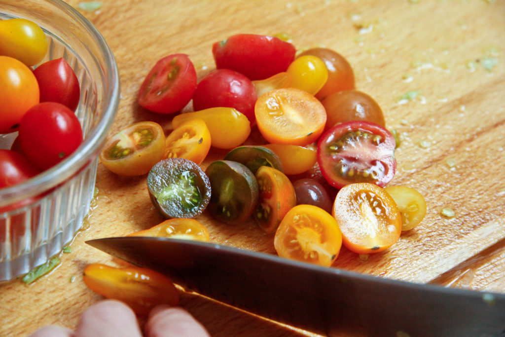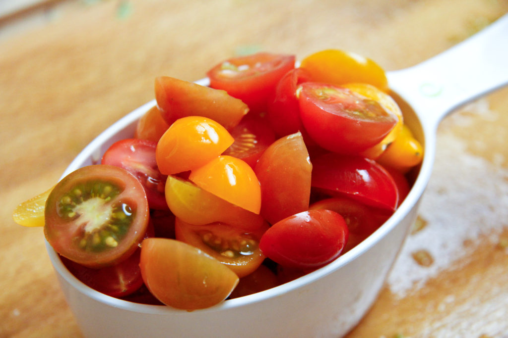 - 1 cup of halved mixed baby heirloom or cherry tomatoes (see tip below)