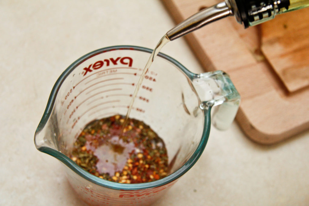 After you add your minced garlic, dried spices, and a touch of honey, stream in your olive oil…