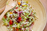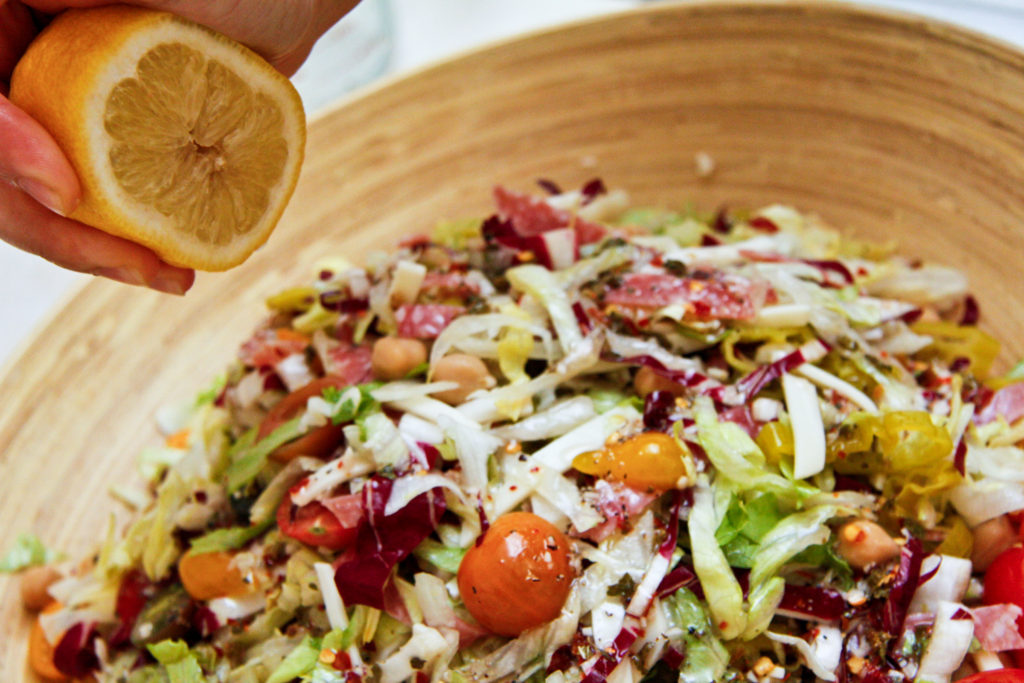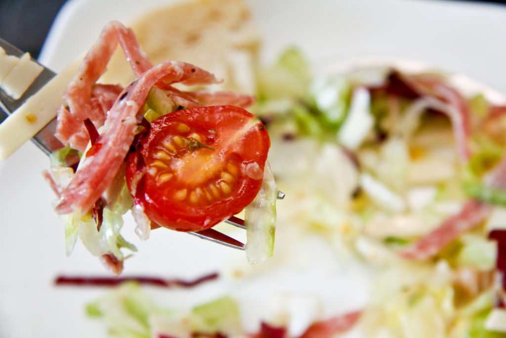 I think what had me at hello was the salami, and lots of it. That’s why in my home version, I felt the need to call it a “savory salami chopped salad.” You should be able to get a little bit of salami with every stab of the fork.