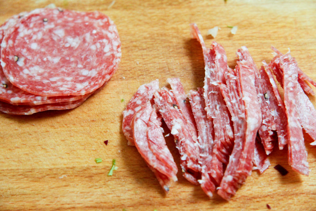 - 22 pieces of pre-sliced salami from a package thinly sliced into strips