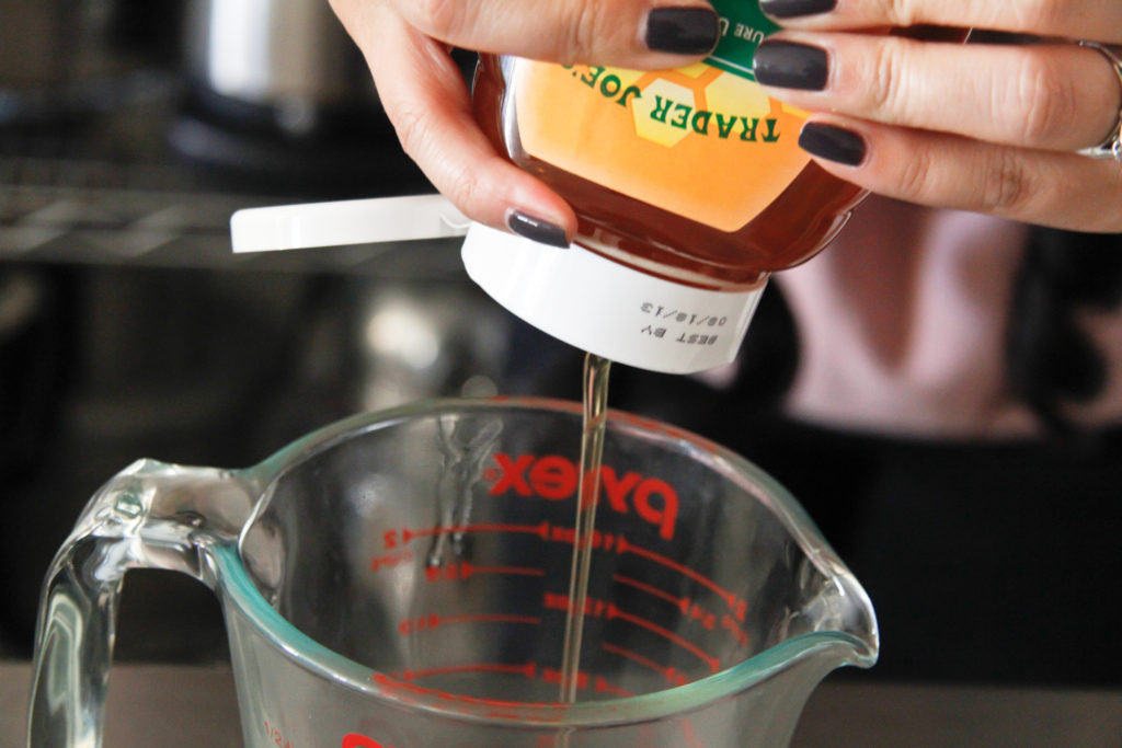 In a separate bowl, you make a sweet mixture which will act as your glue to hold all the nutty pieces together. Squirt in honey with some brown sugar. Add vegetable oil.