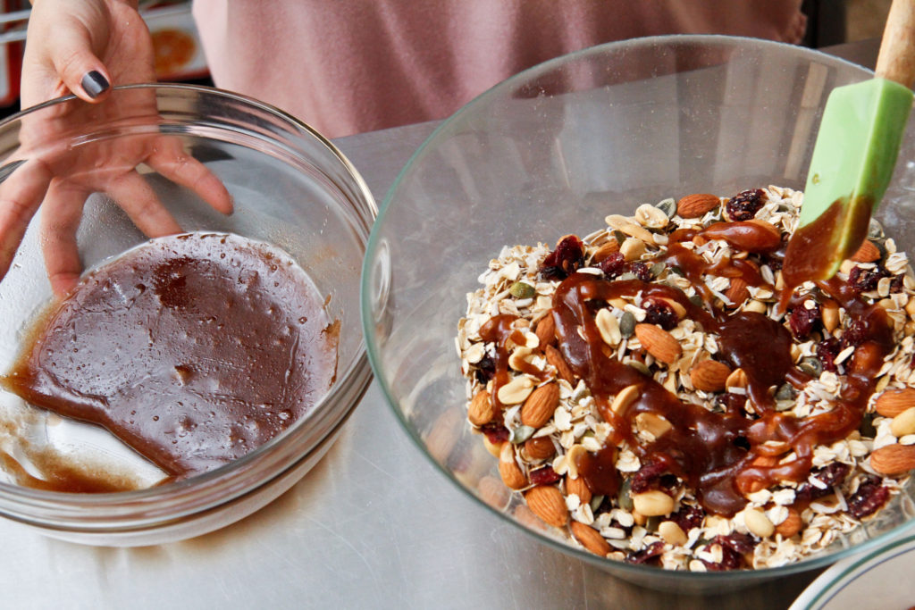 You drizzle it over your dry mixture. It will seem like there’s not enough glaze to coat all that granola, but don’t worry, it will. Just work in batches if you have to.