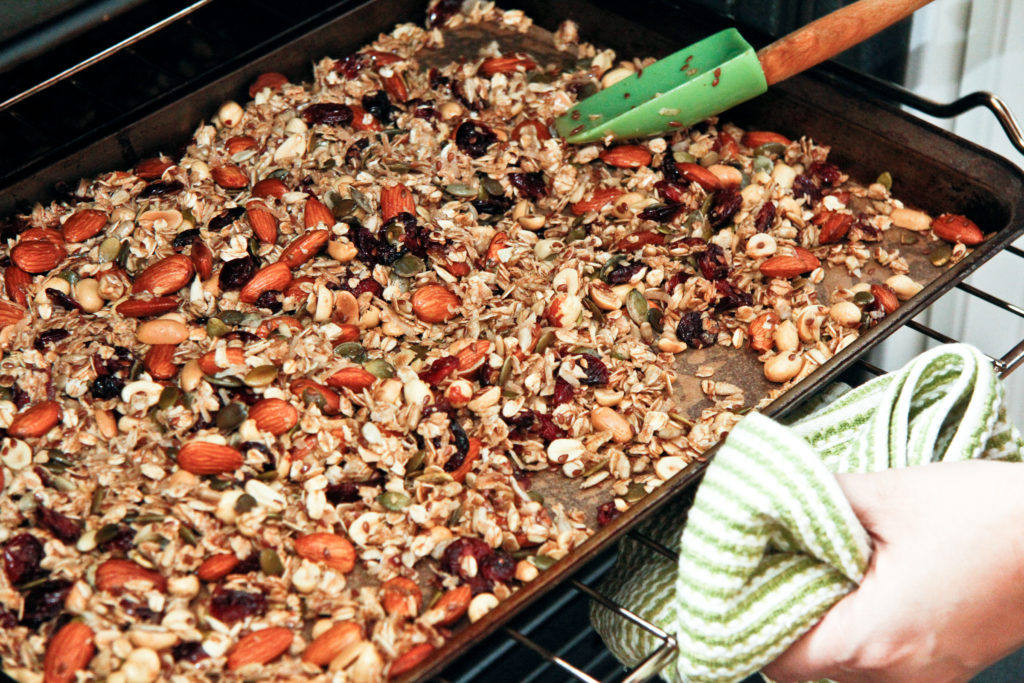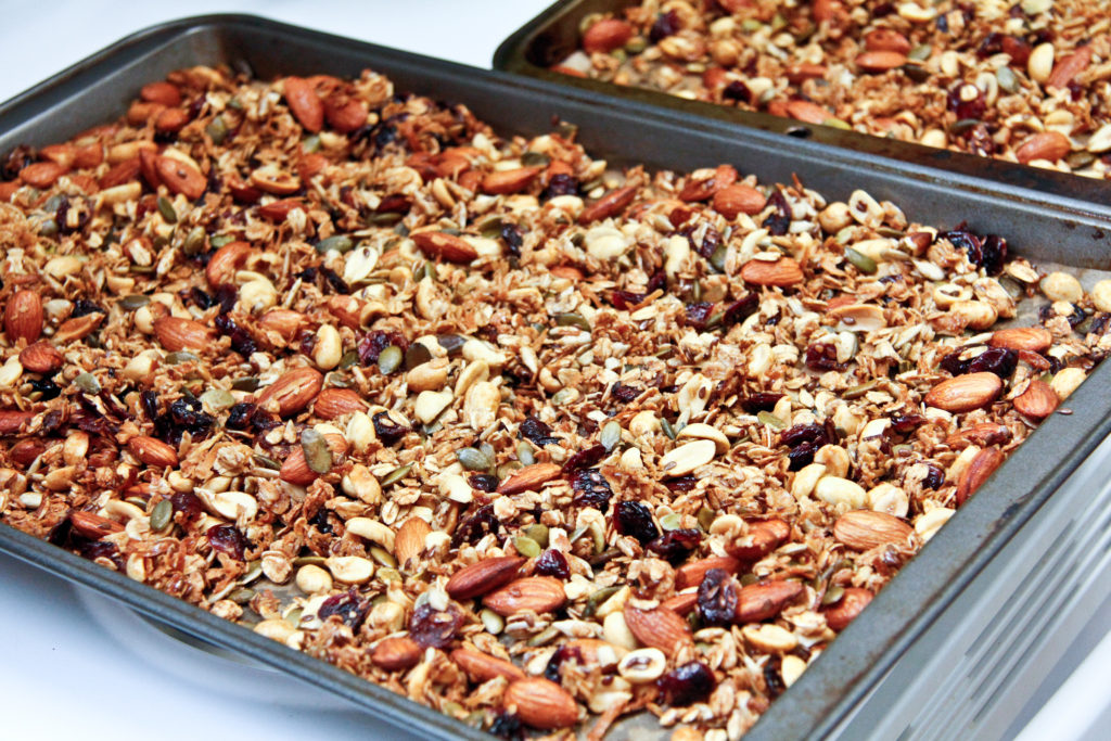 The pans go into a preheated 250 degree oven for anywhere between 45 minutes to an hour. Just be sure to stir the granola around every 15 minutes. You’ll see it start to brown on the edges first, so you’re going to want to distribute the heat.