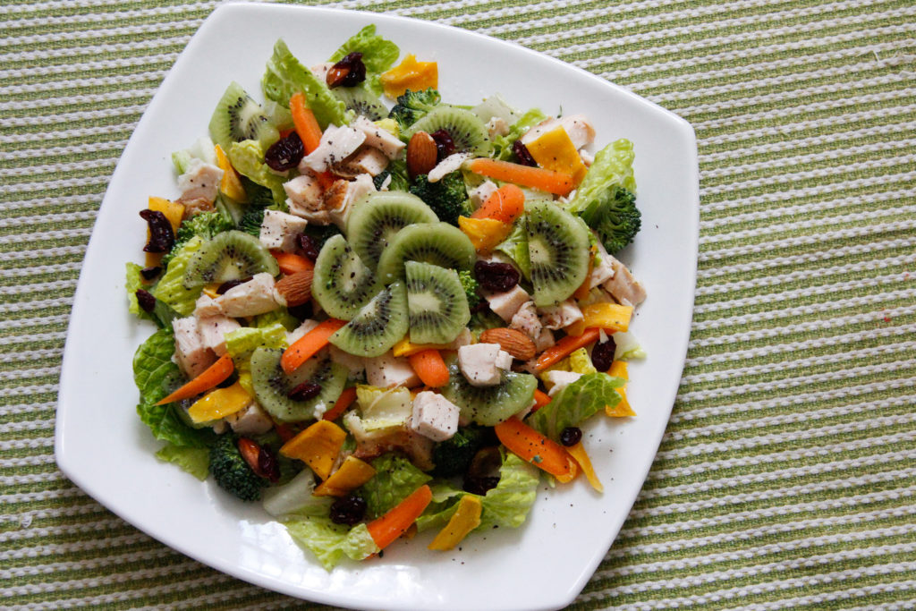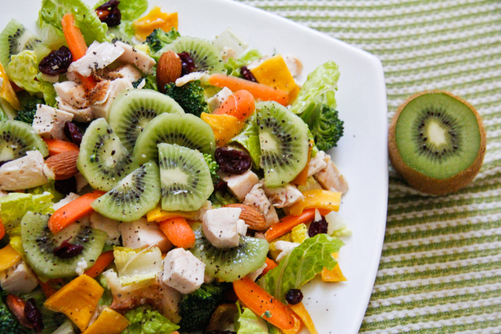 But I discovered that I really enjoyed eating them sliced up in salads! Even if you’re not a huge fan of fruit in food, the kiwis are both sweet and tart, which works perfectly against some crunchy lettuce greens and a light lemony vinaigrette. The kiwi slices add a nice refreshing touch.