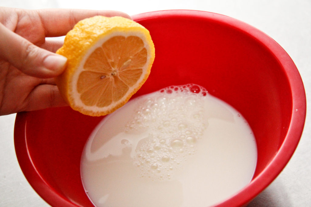 It all begins with “soured” milk. What I’m doing here is substituting regular milk for buttermilk. If you have buttermilk, just use it. For the rest of us who don’t normally have it on-hand, add white vinegar or fresh lemon juice to your regular milk and let the mixture stand for 10 minutes. White vinegar works better than lemon juice, but lemons were all I had.
