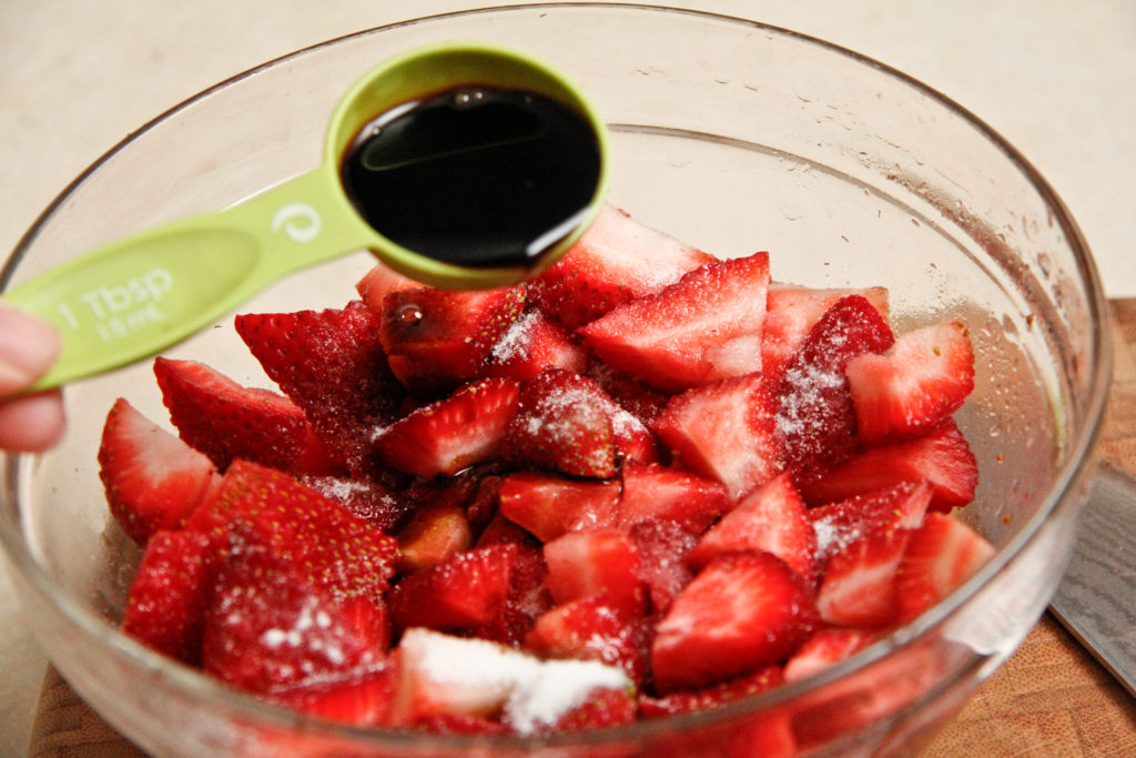 - Meanwhile, add the coarsely chopped strawberries, sugar, and balsamic vinegar together in a bowl and mix. Let stand until the strawberries become slightly broken down and release their sugars and juices, about 10 minutes.
