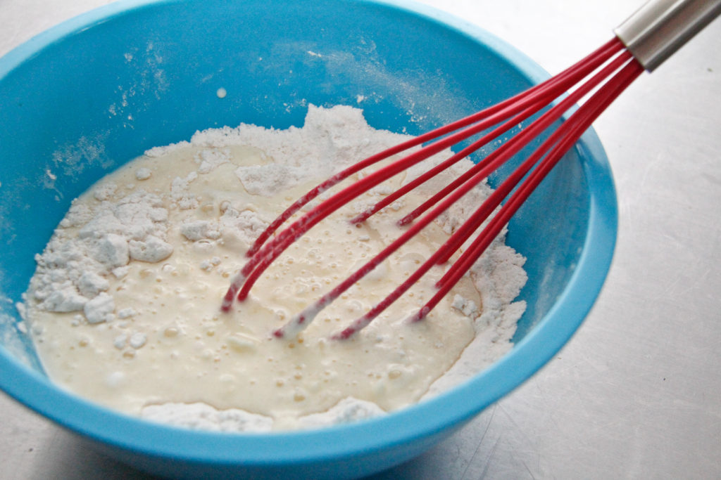 - Whisk the egg, melted butter, and vanilla into the "soured" milk, and then add it to the dry ingredients. Whisk well to form a smooth batter. Make sure all the lumps are gone. Let the batter rest for 30 minutes before using. It will get thicker as it rests.