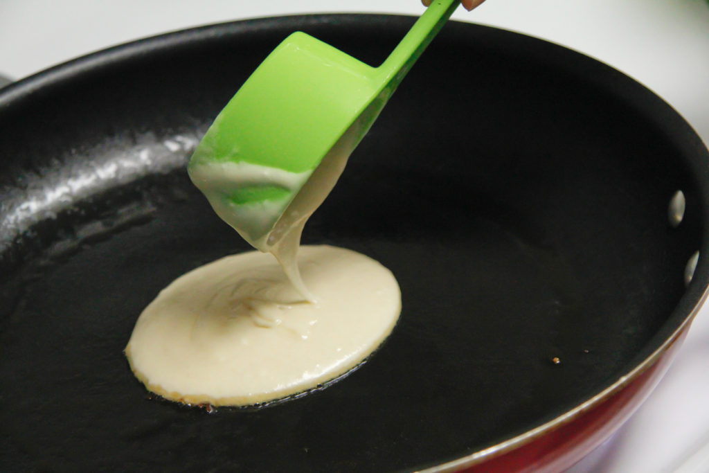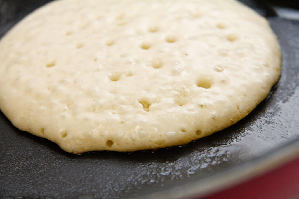 It’s a good idea to use a ¼ cup measuring cup to scoop out the proper amount of batter for each pancake. This is particularly useful if you’re making multiple pancakes at one time on a long griddle. That way they cook at the same time.