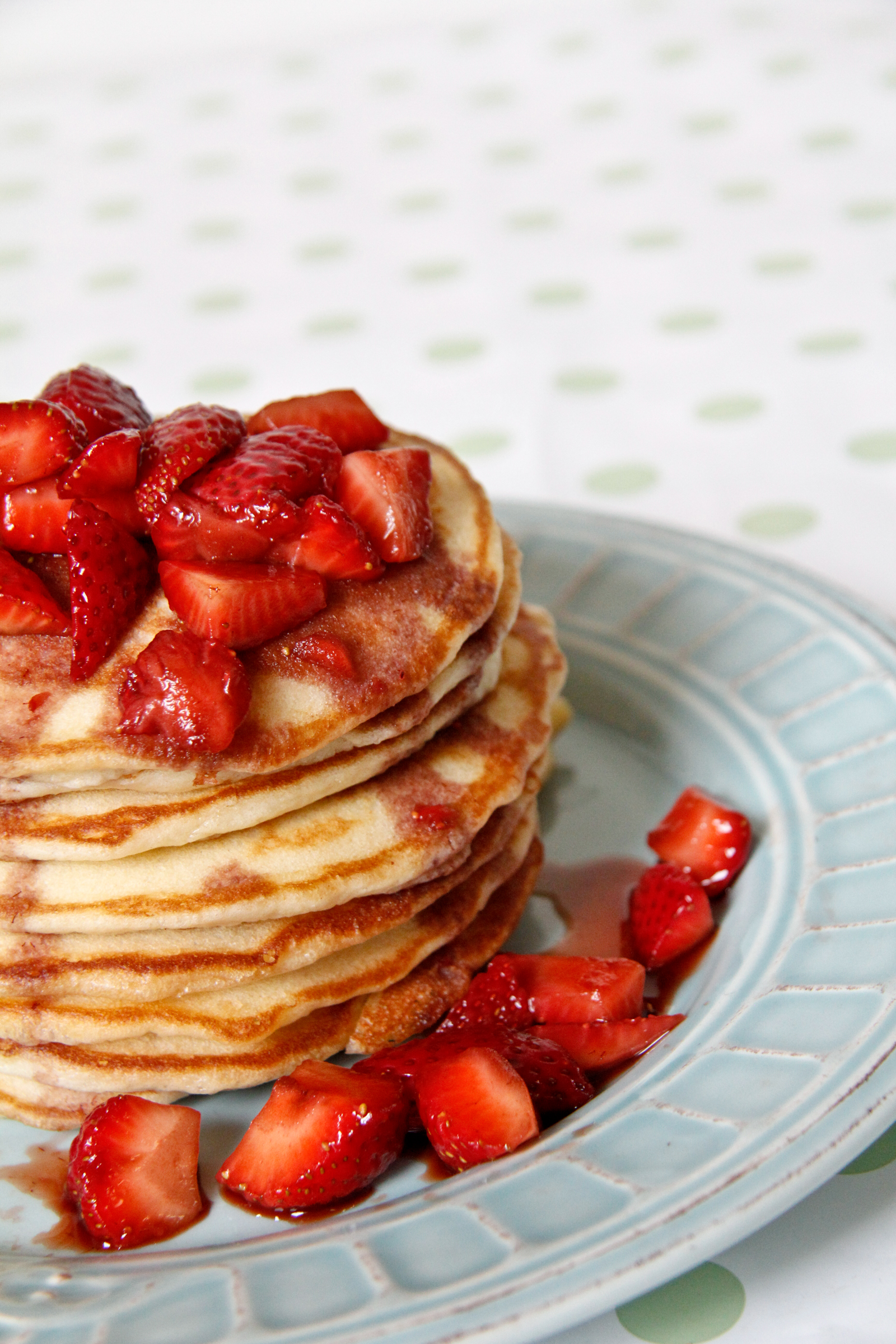The juicy strawberries are sweet, pretty, and refreshing. They work so well with the otherwise plain pancake. I know my mom would love to taste these and I’ll have to make them for her one day. I mean, they’re not Bisquick and Mrs. Buttersworth’s, but I have a feeling that she wouldn’t mind one bit.
