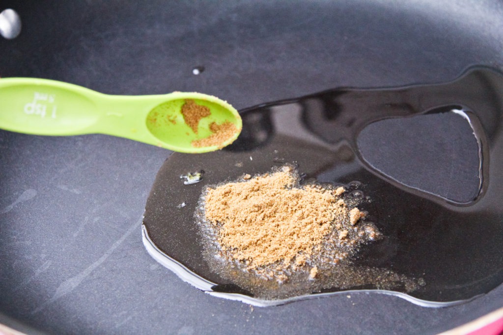 Add 1 tablespoon of olive oil to a pan and toast your ground cumin for a few seconds. Give it a stir and let that warm spice infuse your oil. Then you can add your drained chickpeas.