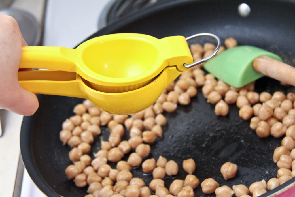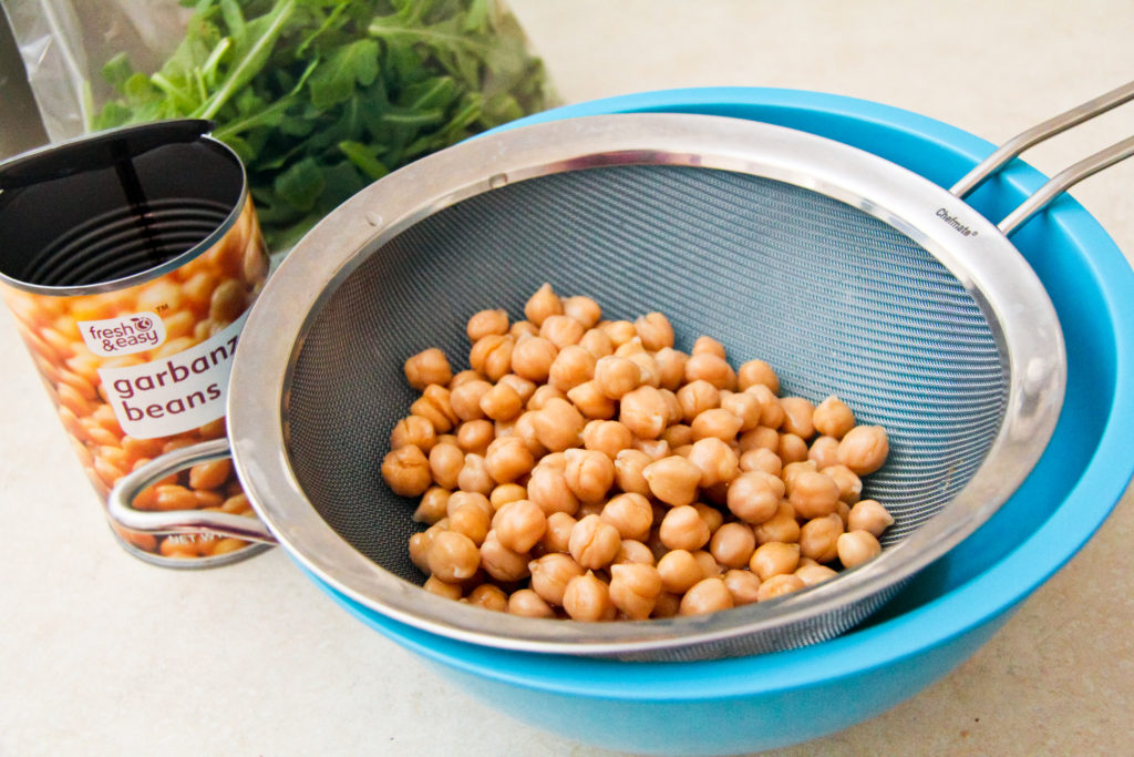 The chicken cooks quickly, but so does your side dish. Drain your can of garbanzo beans, and give them a rinse.