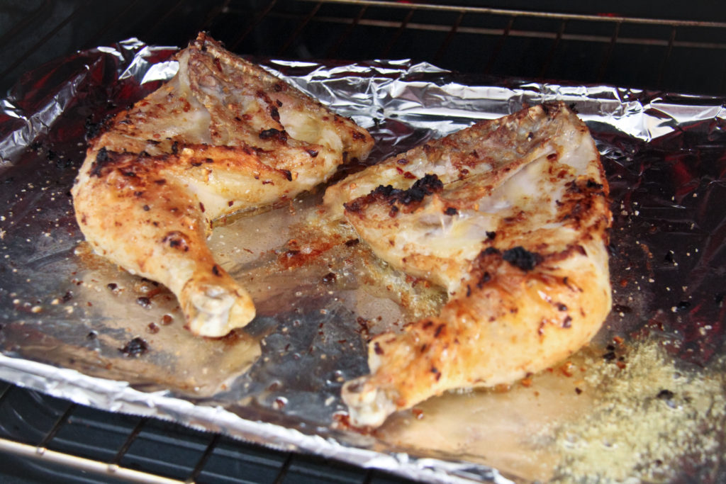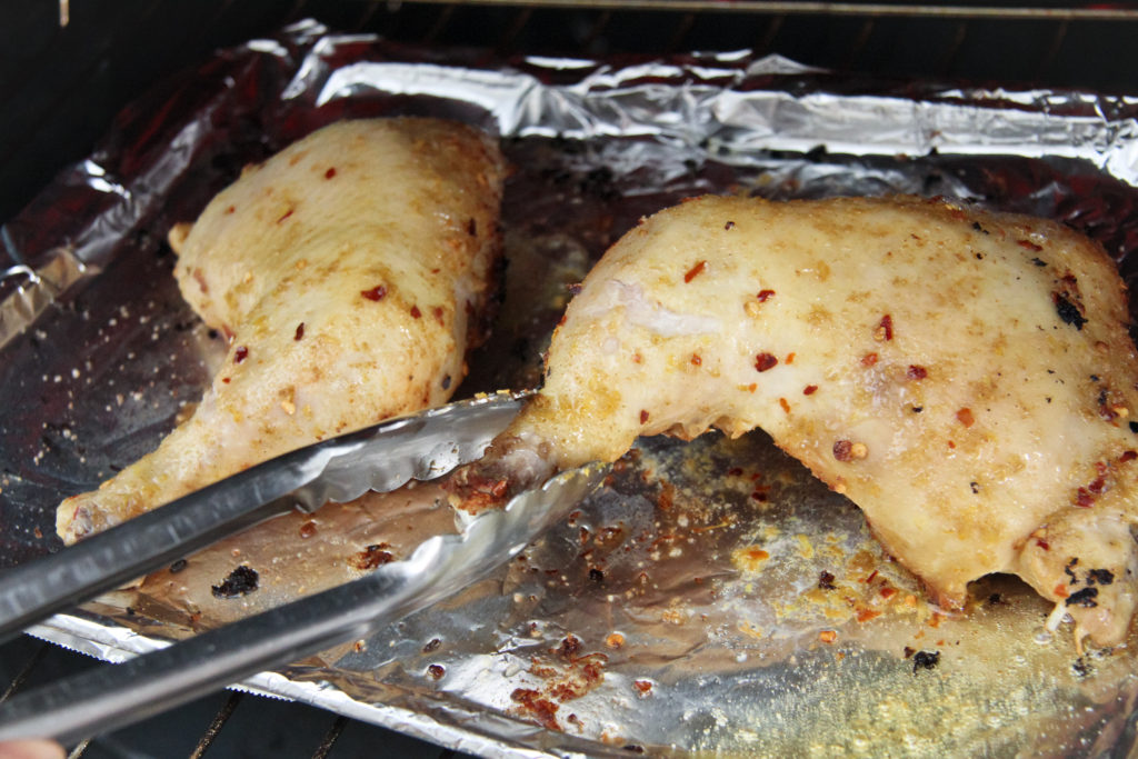 You turn on your broiler and set your rack on the second to the highest rung. You want it close enough to the broiler, but you don’t want it to scorch too quickly. The important step is to first flip your chicken quarters “upside down,” or skin side down. Then place them under the broiler.