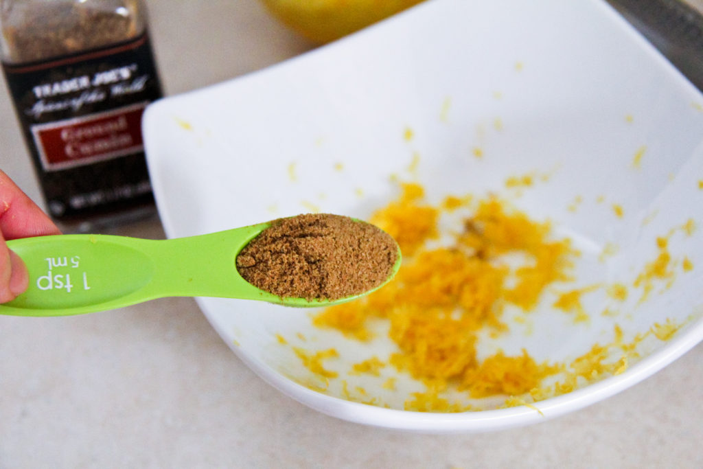 So that’s where my lemon zest went, along with kosher salt, and my usual spices of choice, ground cumin and crushed red chili flakes. The chili flakes add heat and the cumin adds smoky warmth.