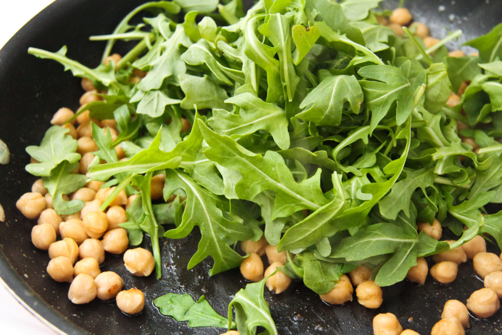 Turn the heat off your pan, and tumble in your gorgeously green arugula. You don’t need much heat to wilt the leaves.