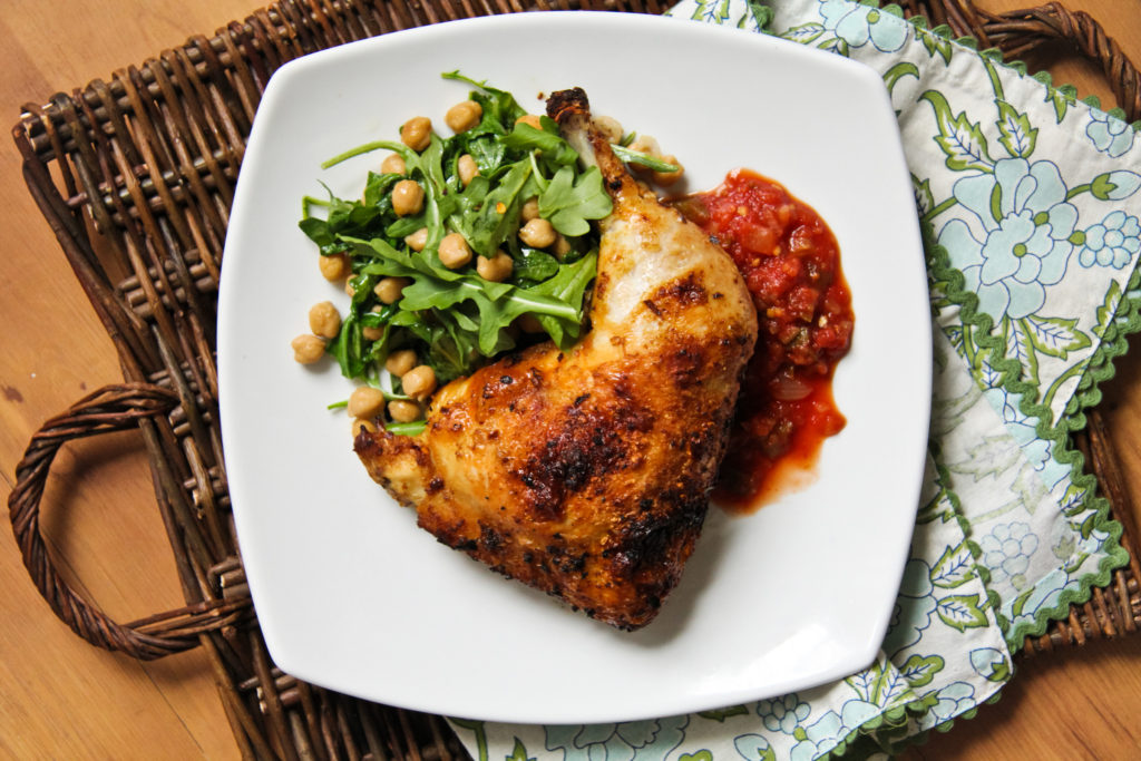 You can serve the crispy spice-rubbed chicken alone with the chickpeas and arugula, or with a dollop of salsa on the side, for an extra flavor punch.