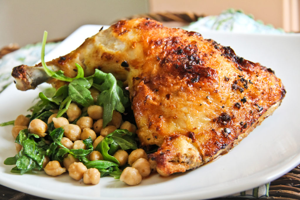 The chicken is moist, flavorful, and fragrant. The warm chickpea and arugula salad is a lemony and satisfying side dish that compliments the chicken. This dish is easy enough to prepare on any night of the week, but still looks impressive for a dinner party. If you want to heft it up, just add some mashed potatoes or rice pilaf.