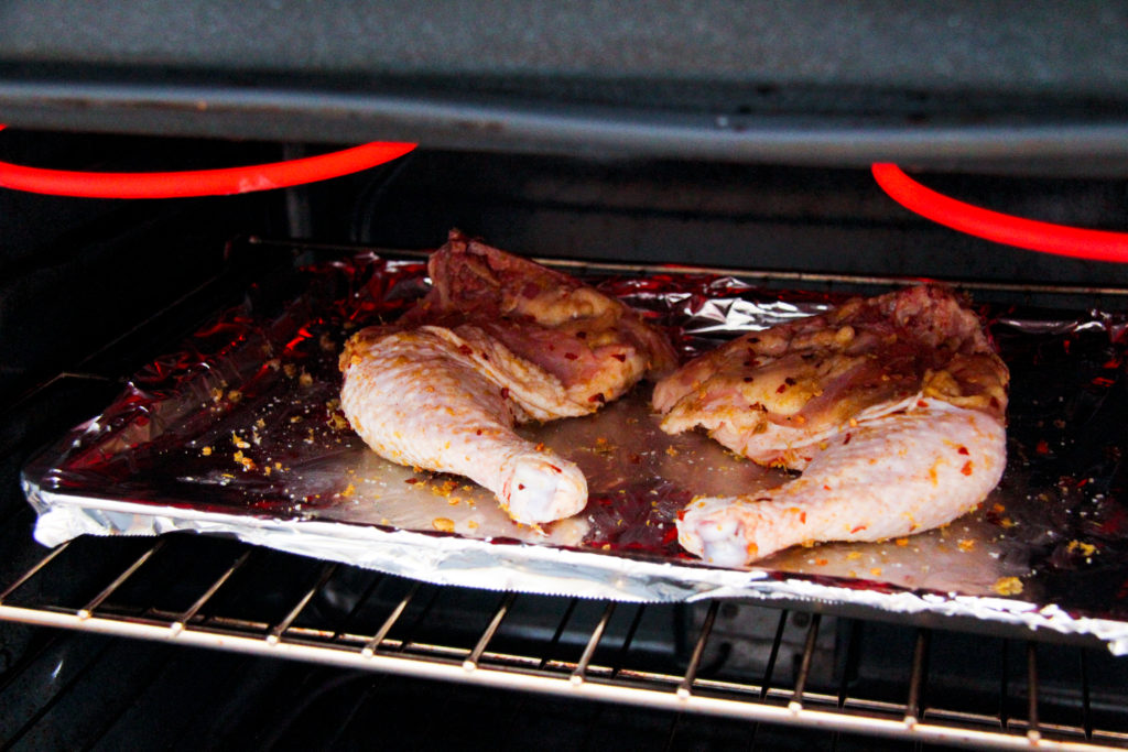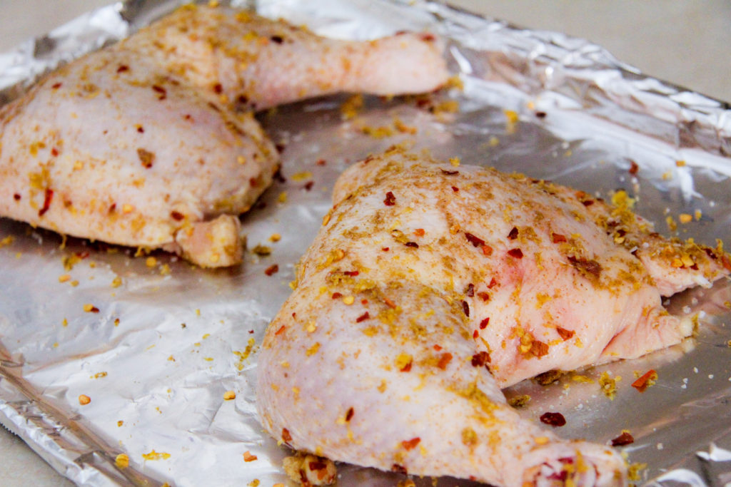 Two skin on, bone-in chicken leg and thigh quarters got a spice massage, then placed on an aluminum foil lined baking sheet. No extra oil required, thanks to the natural fat from the skin.