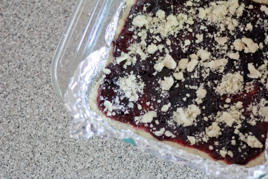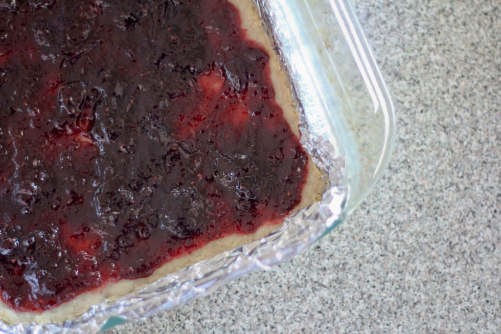 - Bake the crust, 15 minutes. Spread the preserves on top, leaving a ½ inch border; crumble the reserved dough on top. Return to the oven and bake until the edges are golden brown, 25 more minutes. Let cool 20 minutes, then lift out of the pan and cut into squares.