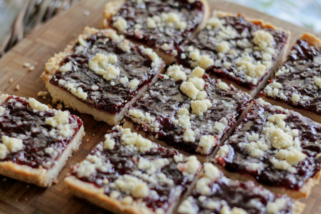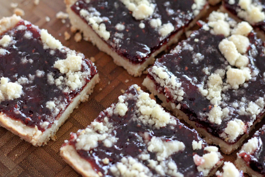 A while ago, my friends and I had a cookie making party at my place and I had a big jar of raspberry jam in my fridge leftover from making linzer cookies. I love those cookies, because of the simple jam and short bread combo, but they kinda take a lot of time to make… with the rolling out of the dough, and using cookie cutters. The good news is that these jam bars taste just like linzer cookies, but don’t take long to make, and require no special equipment. Sold yet?
