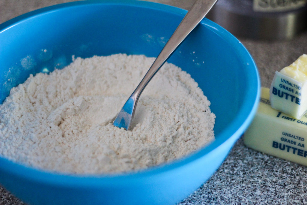 You whisk the sugar, your flour, and a pinch of salt together in a bowl.