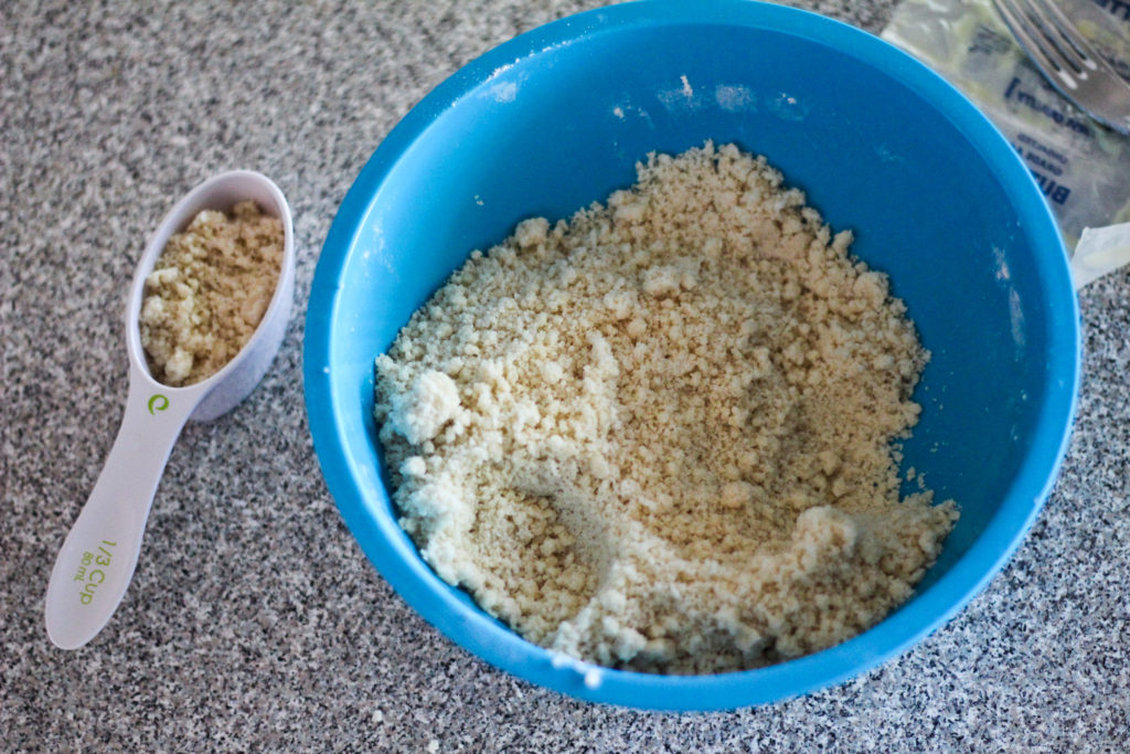 Then you mush in your soft unsalted butter with your fingers until you have a coarse crumbly sand texture. Scoop out 2 tablespoons of your mixture, throw it in the fridge, and save it for later. This will become your topping.