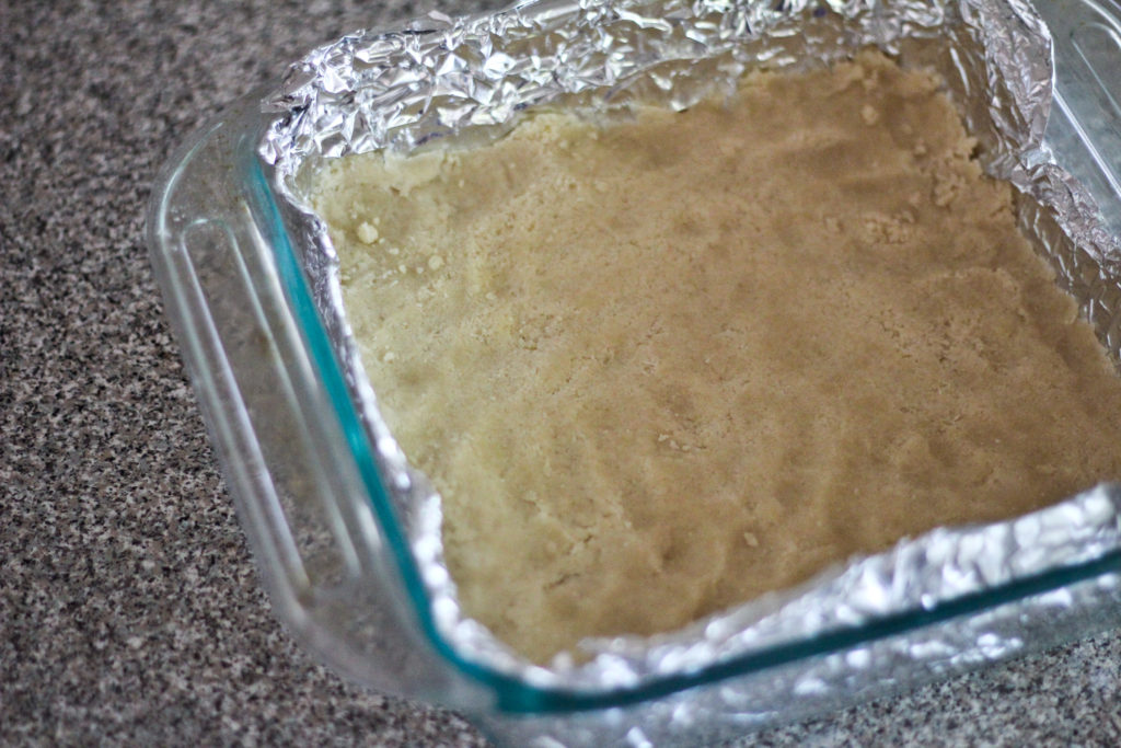 You pour out your remaining “sand” mixture onto your foil lined dish and press it lightly into an even crust with your fingers. Stick it in the freezer for 10 minutes, until firm. Then you pop the crust into the oven for 15 minutes.