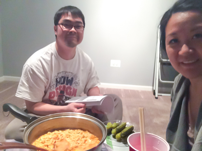 It took us about 8 hours to finish the job! Then I made instant ramen as our first meal in our new home. We used our Keurig coffee maker box as our dining room table, and plopped down on the floor together to eat our dinner. Then we went back to Joe’s parents’ house, where we were staying.