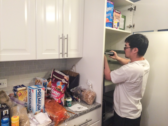 So life continued as normal. And Joe screwed in the pull-out shelves of the pantry first. I was afraid of attracting any other creepy crawler by our food. I wanted to get the perishables tucked away and off the counters as soon as possible.
