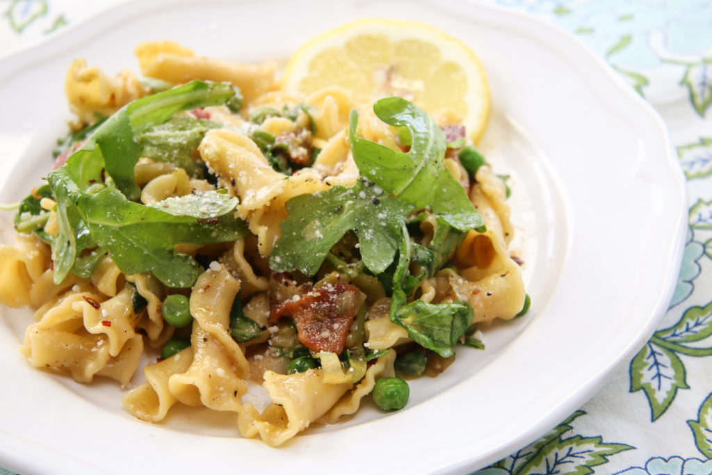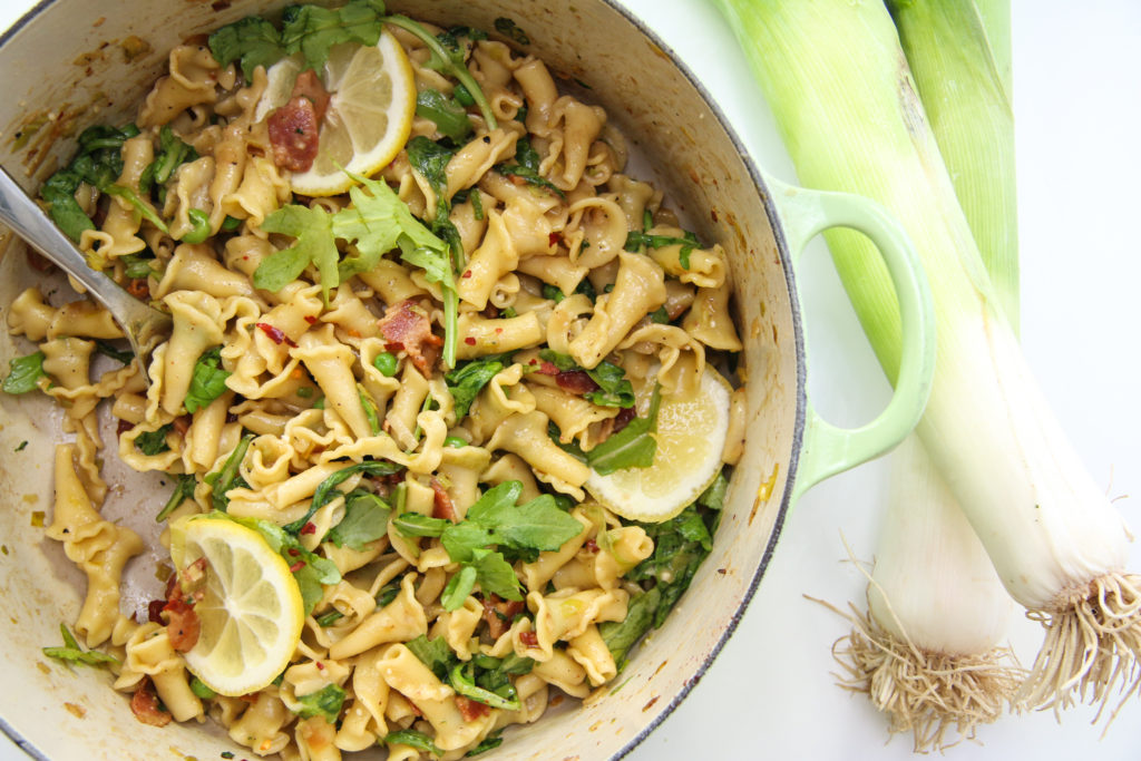 It has all the comforting flavors of classic Carbonara, with the salty bacon and the creamy sauce made with eggs and cheese.  But then I add a sprinkle of crushed red pepper flakes, and a squeeze of fresh lemon to brighten things up a bit.  Once aromatic leeks, sweet green peas, and peppery arugula join the party, winter suddenly gets pushed to the side.