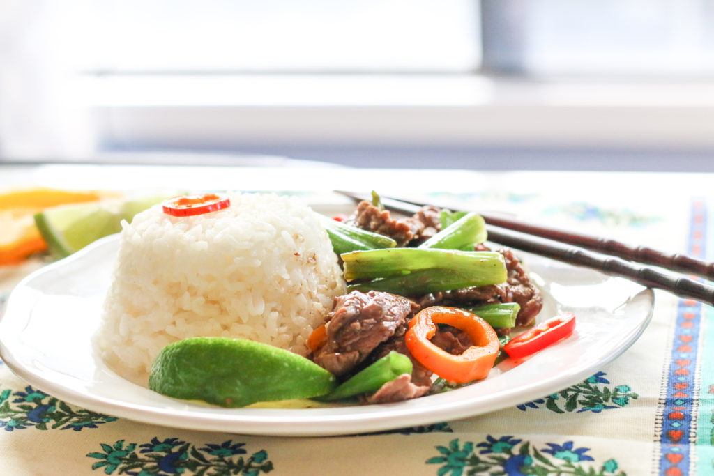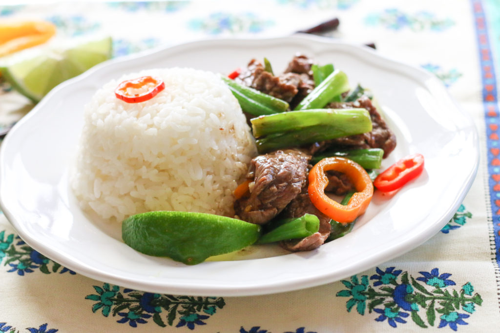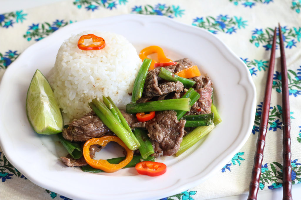 • Add more oil to the pan, along with the scallion whites and garlic. Saute together, for about 1 minute. Whisk the sauce one more time, and add it to the pan. Cook the sauce, while scraping the bottom of the pan with a wooden spoon or spatula, to pick up the brown bits. When the sauce comes to a bubble, add back the steak, along with the peppers and scallion greens. Toss and cook for 1 minute more. Remove from the heat and serve with rice.