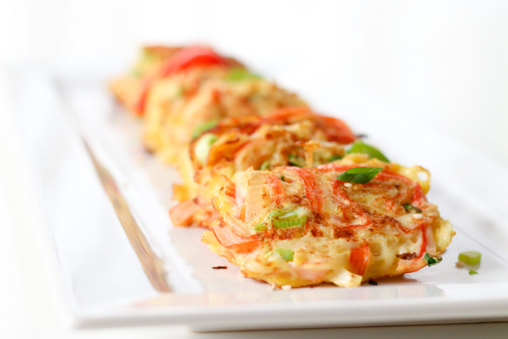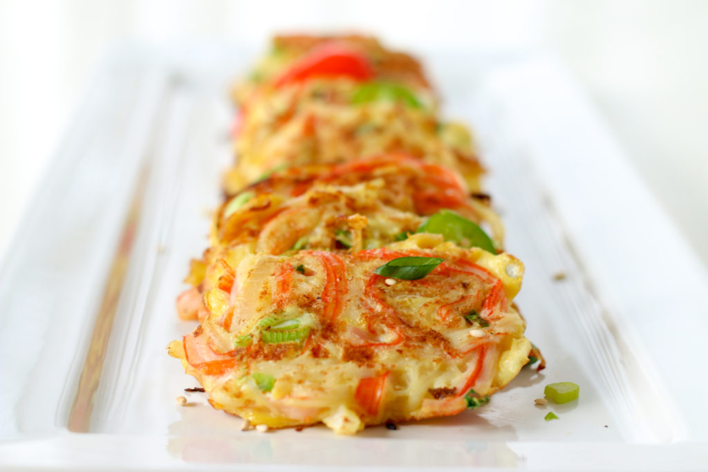 When we were visiting my parents on the east coast over the holidays, my mom nonchalantly busted out a plate of these Korean Crab Jeon, or Crab Stick Omelettes for us. They looked humble enough, but when I took that first bite, it was a delightful burst of flavor, and I immediately asked her how she made them.