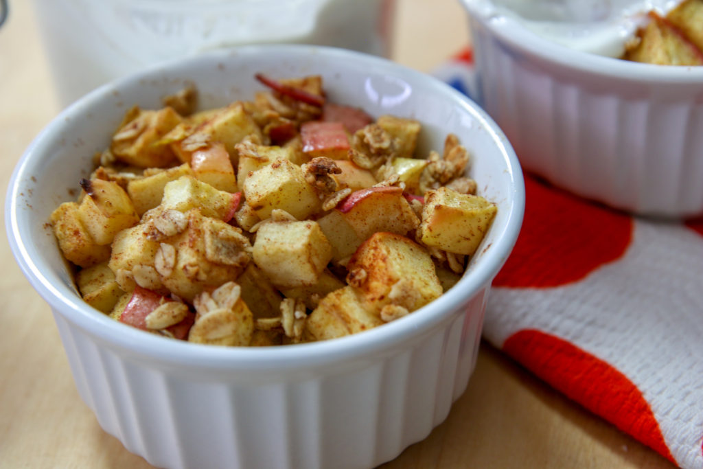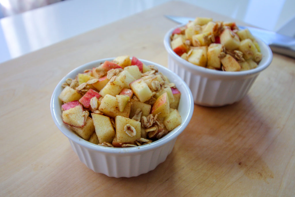 - In a bowl, combine diced apples, maple syrup, oats, coconut oil, and cinnamon. Divide mixture into the ramekins.
