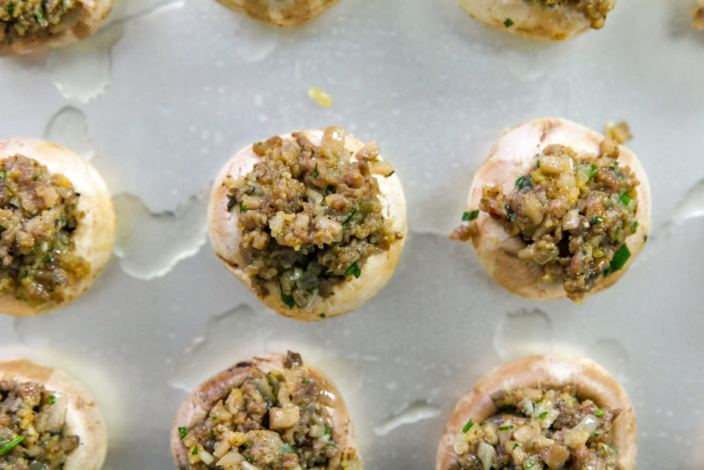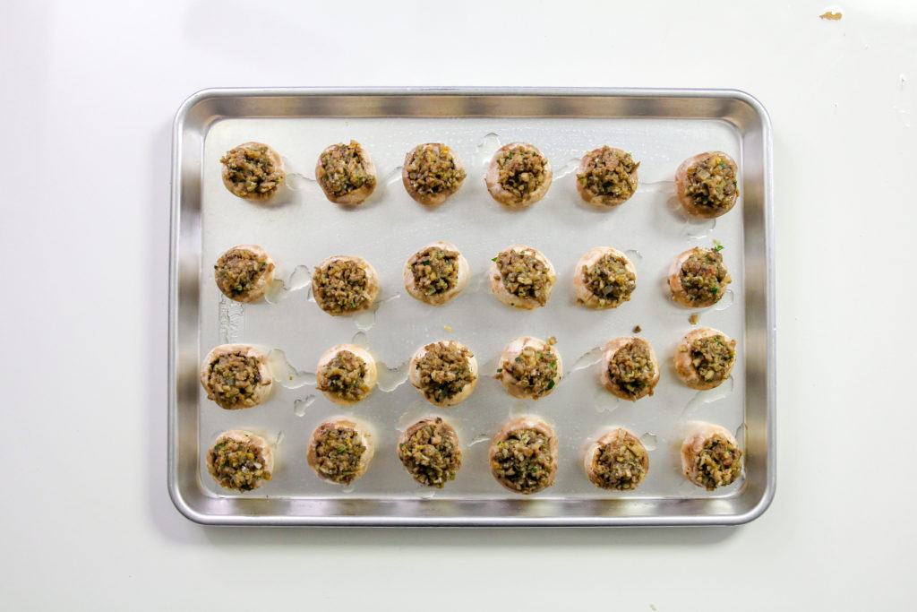 • Preheat oven to 375ºF. In a large skillet, heat oil over medium-high (if you need it). Cook sausage, breaking it up with a fork until crumbly and no longer pink, about 5 minutes. Add garlic, shallot, and chopped mushroom stems; lightly season with salt and pepper (don’t go overboard because the sausage and Parmesan cheese will add saltiness too). Reduce heat to medium, and saute until sausage is cooked through and vegetables are tender, stirring occasionally, 4 to 6 minutes. Transfer to a bowl, stir in parsley and thyme, and let cool.